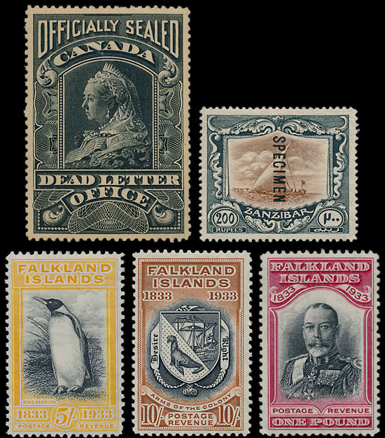 Similarly, in other countries, a Zanzibar 1913 Specimen 20r to 200r range sold for £740 and a Falk Is Centenary set sold for £2,240. A rarely seen Canadian Qn Victoria Dead Letter stamp was bought for £224.
