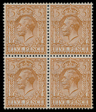 Great Britain included a range of 1912-24 M/UM blocks of 4 with watermark varieties, the highlight being a rare 5d watermark inverted block (one stamp with small gum stain) that realised £1900.