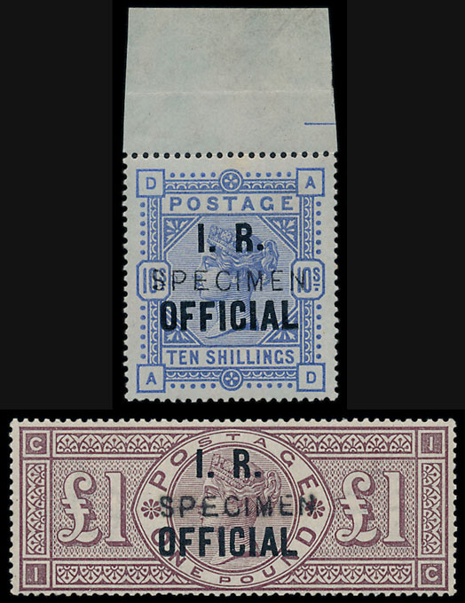 The GB section included a range of Official overprints of exceptional quality, again resulting in some very high realisations. An Inland Revenue 1884-8 10/- with variety ‘raised stop after R’, sold for £2,480 and from the same series, a £1 ‘specimen’ sold for £2,950.