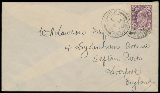 A tidy Falkland Islands cover to Liverpool with South Georgia cancel sold for £450.