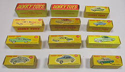 Moving on to the die cast models section, Lot 246, a collection of earlier boxed Dinky cars, including Sunbeam Alpine Sports No 107, Rover 75 Saloon No 156, Ford Zephyr Saloon No 162, Sunbeam Rapier Saloon No 166, Singer Gazelle No 168, Studebaker Golden Hawk No 169, Studebaker President Sedan No 179, etc. This lot sold for £675.