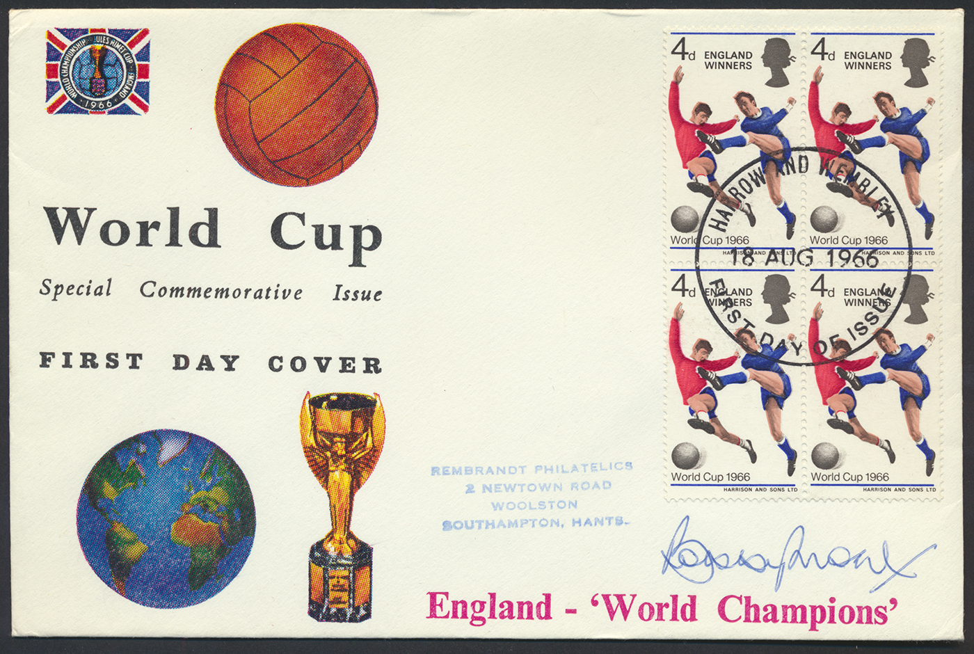 The less frequently seen, but ever-popular, signed covers also saw excellent results with both lots in the sale selling for above and beyond their original estimates. The first of the two, lot 105, included a range of signed 1966 World Cup First Day Covers and a thank you letter on 10 Downing Street letterheaded paper handwritten and signed by Winston Churchill with original typed envelope marked PRIME MINISTER. After much bidding this collection, sold for twice the estimate with a hammer price of £700. Lot 106, comprised of only two items: a 1966 World Cup First Day Cover signed by Bobby Moore and World Cup Willie postcard signed by Alf Ramsey, both cancelled with Harrow and Wembley cds, again selling over estimate for an impressive £350.