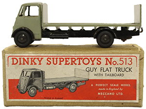 Lot 345 a Dinky 513 Guy Flat Truck with Tailboard, 1st cab type, grey cab and flatbed, black chassis, wings and hubs sold for £120 and had an estimate of £100. Lot 348 Dinky a Vega Major luxury coach purple side, blue interior No 952 sold for £110 and had an estimate of £100.