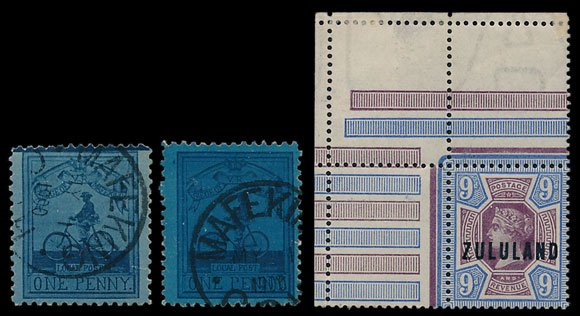 Issues from the 1900 siege of Mafeking are always popular so the 1d Bicycle stamps available will no doubt sprint away. An attractive Zululand 1888-93 9d in corner marg.