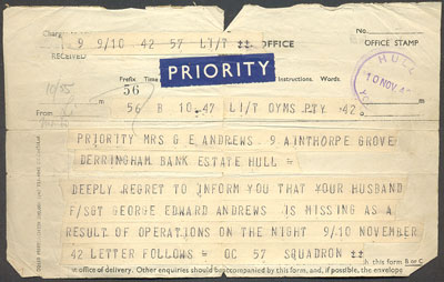 Sgt Andrews qualified as a Wireless Operator in April 1940 and an Air Gunner in June 1940. His flying details start on 15th September 1940 based in Scotland with 57 Sqn flying Blenheims, mostly on sweeps over the North Sea. The Sqn moved to England in December 1940 and converted to Wellingtons and joined in the strategic night bombing offensive, with him flying on a night raid to Rotterdam on 10th February, with further raids to Bolougne, Cologne, Hamburg, Kiel, Brest and Bremen.