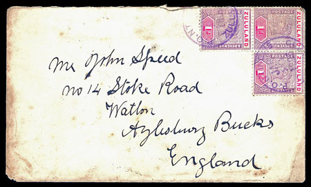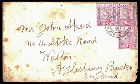 Zululand covers of the period are known, sent back to Britain by settlers and European administrators, but these are usually posted from towns such as Eshowe. However the covers in a correspondence we auctioned in March 2013 were all from smaller settlements. The first cover, dated January 1894 was posted from Nqutu, a small village 140 miles north-west ofDurban. It was routed via Rorke’s Drift and Durban. This cover realised £1,380.