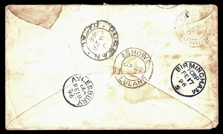 However it is the final 2 covers which were really exciting. They were dated January 1896 and April 1896 and were both from Ntingwe. The former was routed via Eshowe and Durban and the latter via Nqutu, Dundee and Durban. In the standard book on Zululand postmarks by Davis and Joseph, it is stated that the Ntingwe post office was only open for 9 months and it is probable that it closed down because the area never developed fully, or else it was too close to the existing post office at Nkandhla. Whatever the reason, covers bearing the postmark were apparently unknown until our auction in March 2013. The better cover of the two realised £2,242.
